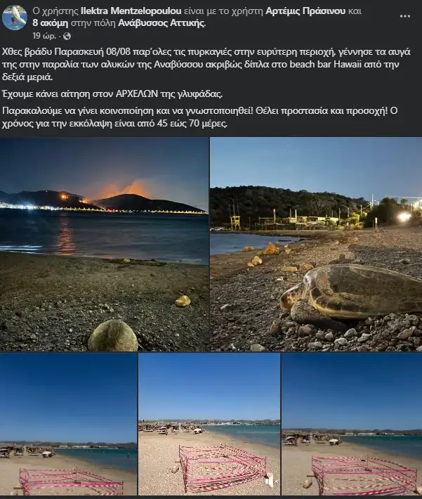 «Χθες βράδυ Παρασκευή 08/08 παρ’ όλες τις πυρκαγιές στην ευρύτερη περιοχή, γέννησε τα αυγά της στην παραλία των αλυκών της Αναβύσσου ακριβώς δίπλα στο beach bar Hawaii από την δεξιά μεριά. Έχουμε κάνει αίτηση στον ΑΡΧΕΛΩΝ της Γλυφάδας. Παρακαλούμε να γίνει κοινοποίηση και να γνωστοποιηθεί! Θέλει προστασία και προσοχή! Ο χρόνος για την εκκόλαψη είναι από 45 έως 70 μέρες», αναγράφεται στη λεζάντα της ανάρτησης.