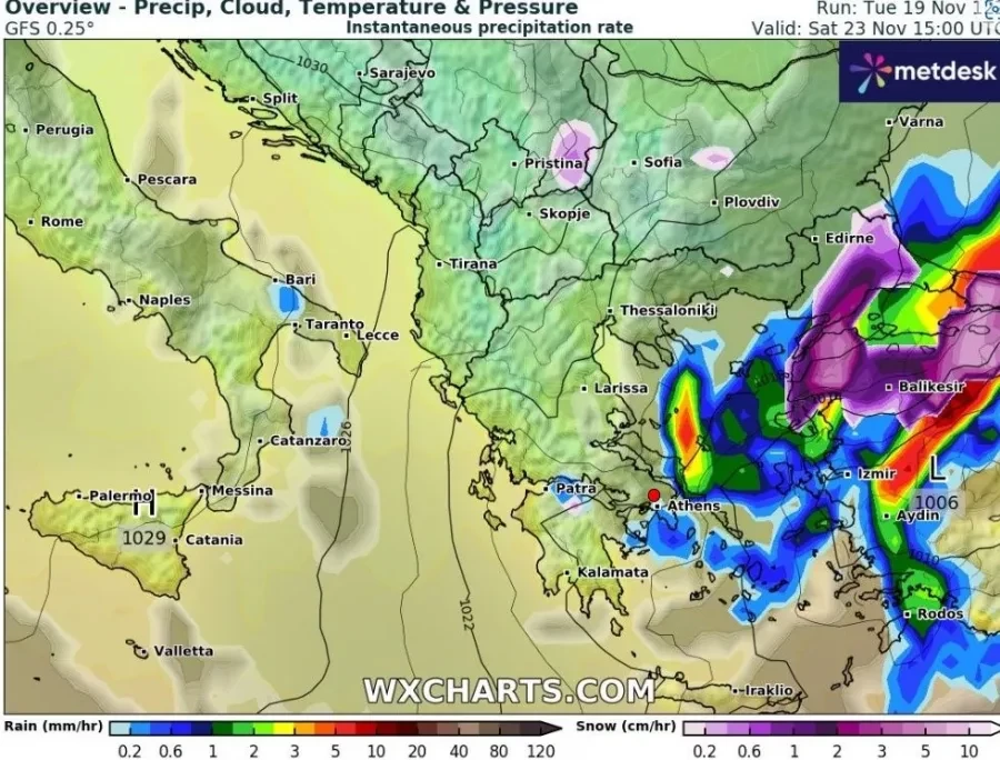 Το μοντέλο διατηρεί την εισβολή ψυχρών αερίων μαζών στη χώρα μας, η οποία στη συνέχεια αναμένεται να κινηθεί προς την Τουρκία.
