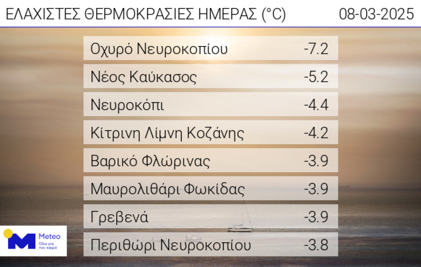 Αρνητικές ελάχιστες θερμοκρασίες σημειώθηκαν κατά τόπους τις πρωινές ώρες του Σαββάτου 08/03 σε ηπειρωτικά κυρίως τμήματα της χώρας μας. Η χαμηλότερη ελάχιστη θερμοκρασία καταγράφηκε στο μετεωρολογικό σταθμό στο Οχυρό Νευροκοπίου και ήταν ίση με -7.2 ˚C . Στον παρακάτω πίνακα παρουσίαζονται οι οκτώ χαμηλότερες ελάχιστες θερμοκρασίες το πρωί του Σαββάτου 08/03 σύμφωνα με το δίκτυο αυτόματων μετεωρολογικών σταθμών του Εθνικού Αστεροσκοπείου Αθηνών / meteo.gr.