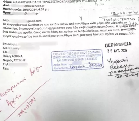 Μία απίστευτη καταγγελία έφτασε στο Αρχηγείο του Πυροσβεστικού Σώματος στην οποία ένας πολίτης ζητά να σταματήσουν να πετούν πυροσβεστικά ελικόπτερα πάνω από την Αθήνα γιατί τον ενοχλεί η… φασαρία.