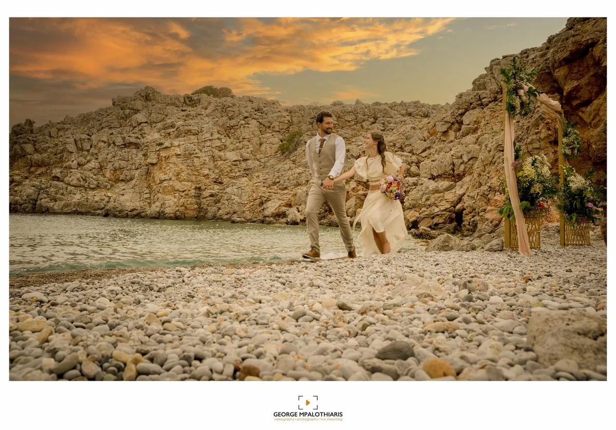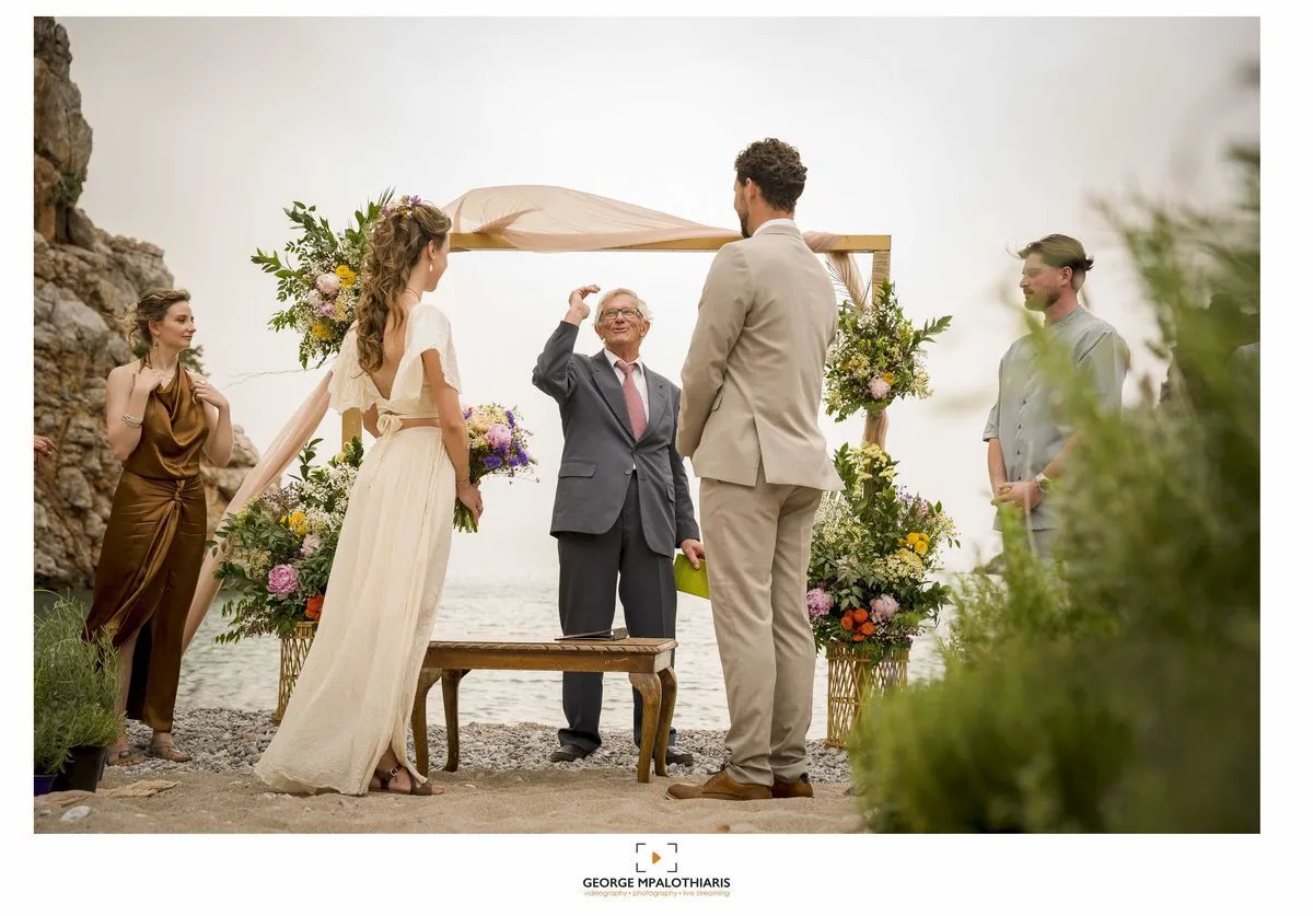 The ceremony took place on Agriomandra beach, located 24 km east of Agios Nikolaos and just 3 km west of Kavousi, Ierapetra. It’s a stunningly beautiful and remote beach, untouched by development and difficult to access—unless by sea or a steep 15–20-minute descent down a rugged slope after a dirt road.