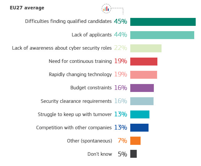 Περισσότερες από τις μισές εταιρείες, που αναζήτησαν υποψηφίους για την κάλυψη θέσεων στην κυβερνοασφάλεια, αντιμετώπισαν δυσκολίες. Οι δυσκολίες σχετίζονταν με την εύρεση υποψηφίων με τα κατάλληλα προσόντα (45%), με την εν γένει έλλειψη υποψηφίων (44%), με την έλλειψη ενημέρωσης (22%) και με τους “στενούς” προϋπολογισμούς (16%).
