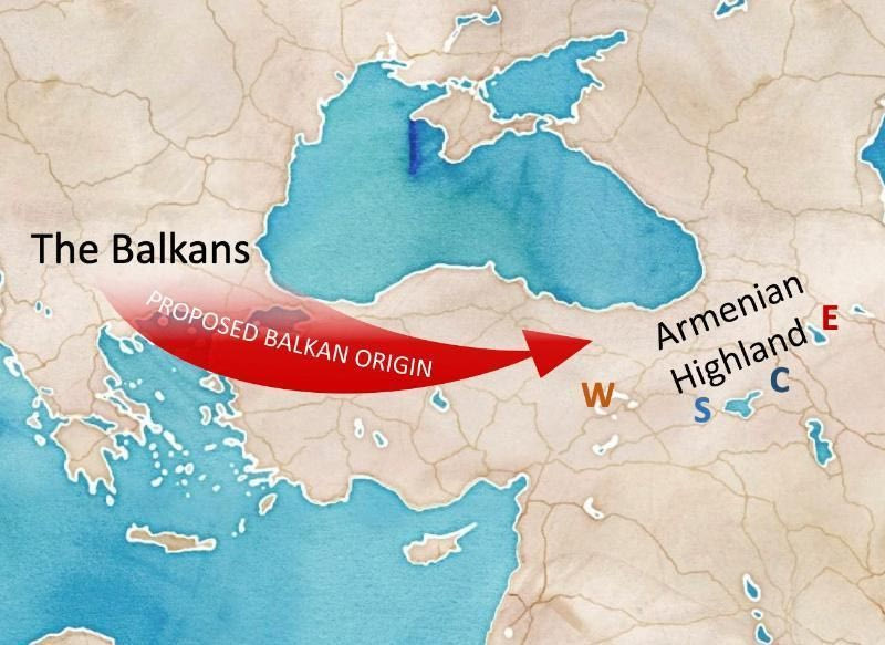 Η θεωρία περί βαλκανικής καταγωγής βασίζεται κυρίως στις αναφορές του Ηρόδοτου, ο οποίος παρατήρησε ότι οι αρμένιοι πολεμιστές που υπηρετούσαν στον περσικό στρατό φορούσαν ίδιες στολές με τους Φρύγες, μετανάστες από την περιοχή της Θράκης που ίδρυσαν βασίλειο στην περιοχή της σημερινής κεντρικής Τουρκίας.