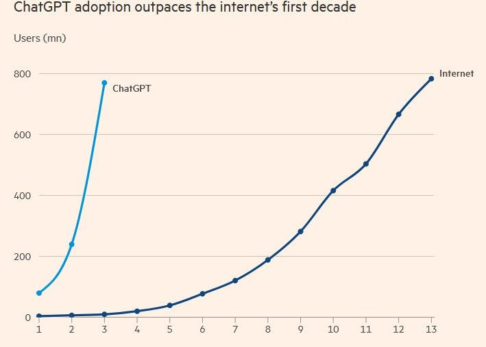 Σύμφωνα με εκτενές ρεπορτάζ των Financial Times, περισσότεροι από 700 εκατομμύρια άνθρωποι χρησιμοποιούν πλέον εργαλεία όπως το ChatGPT, ενώ κάθε εβδομάδα αποστέλλονται πάνω από 18 δισεκατομμύρια μηνύματα προς το σύστημα της OpenAI – ρυθμός διάδοσης που ο παγκόσμιος ιστός χρειάστηκε πάνω από μία δεκαετία για να επιτύχει.