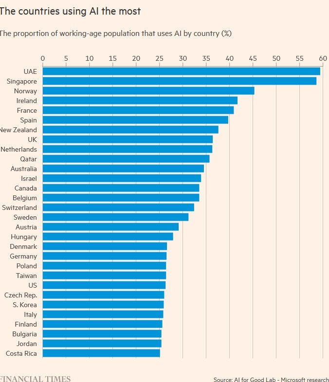 Στην κορυφή της παγκόσμιας λίστας βρίσκονται τα Ηνωμένα Αραβικά Εμιράτα με 59% του ενεργού πληθυσμού να χρησιμοποιεί AI.
