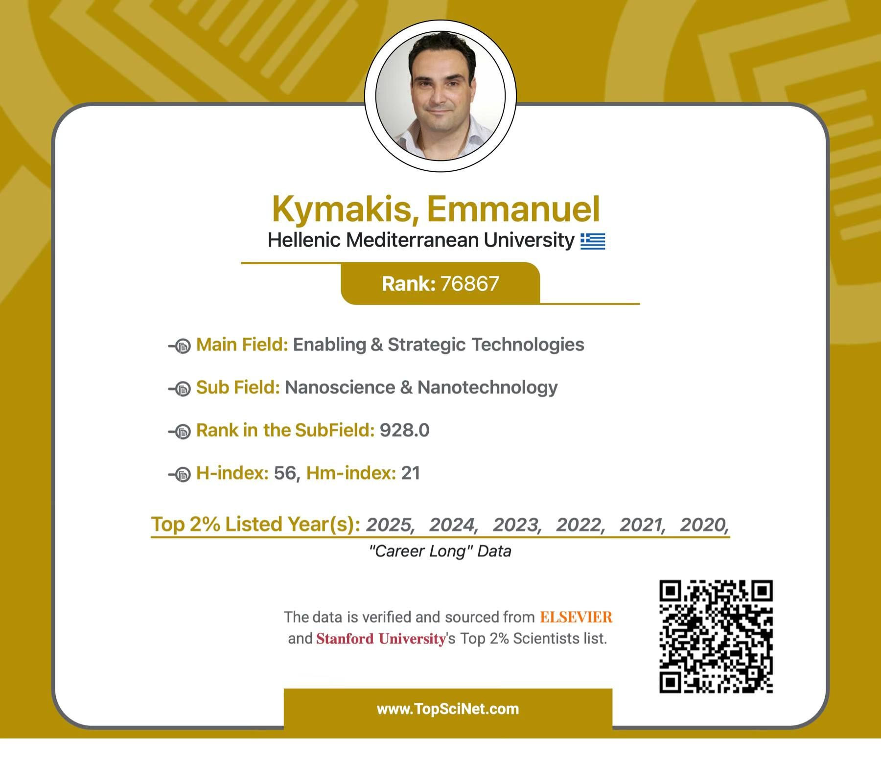 Για έβδομη συνεχόμενη χρονιά, ο καθηγητής του Ελληνικού Μεσογειακού Πανεπιστημίου (ΕΛΜΕΠΑ), Μάνος Κυμάκης, συγκαταλέγεται στη διεθνή λίστα του Stanford University με το «World’s Top 2% Scientists», η οποία καταγράφει το 2% των κορυφαίων επιστημόνων παγκοσμίως.