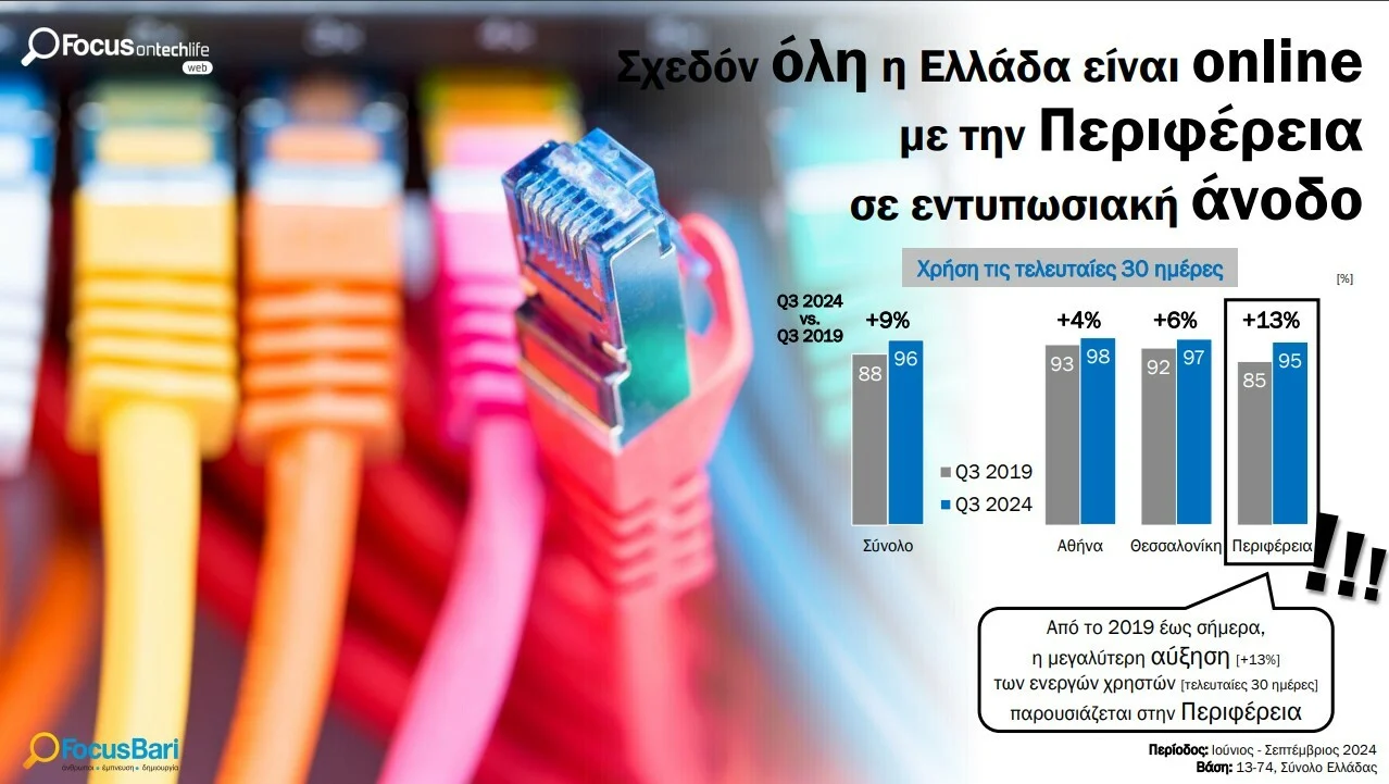 Η συγκεκριμένη έρευνα διεξάγεται Πανελλαδικά συνεχώς από το 1995 και δείχνει πως σχεδόν όλη η Ελλάδα είναι online – σε συντριπτικά ποσοστά – με την Περιφέρεια να σημειώνει εντυπωσιακή άνοδο δέκα ποσοστιαίων μονάδων σε σχέση με το 2019.