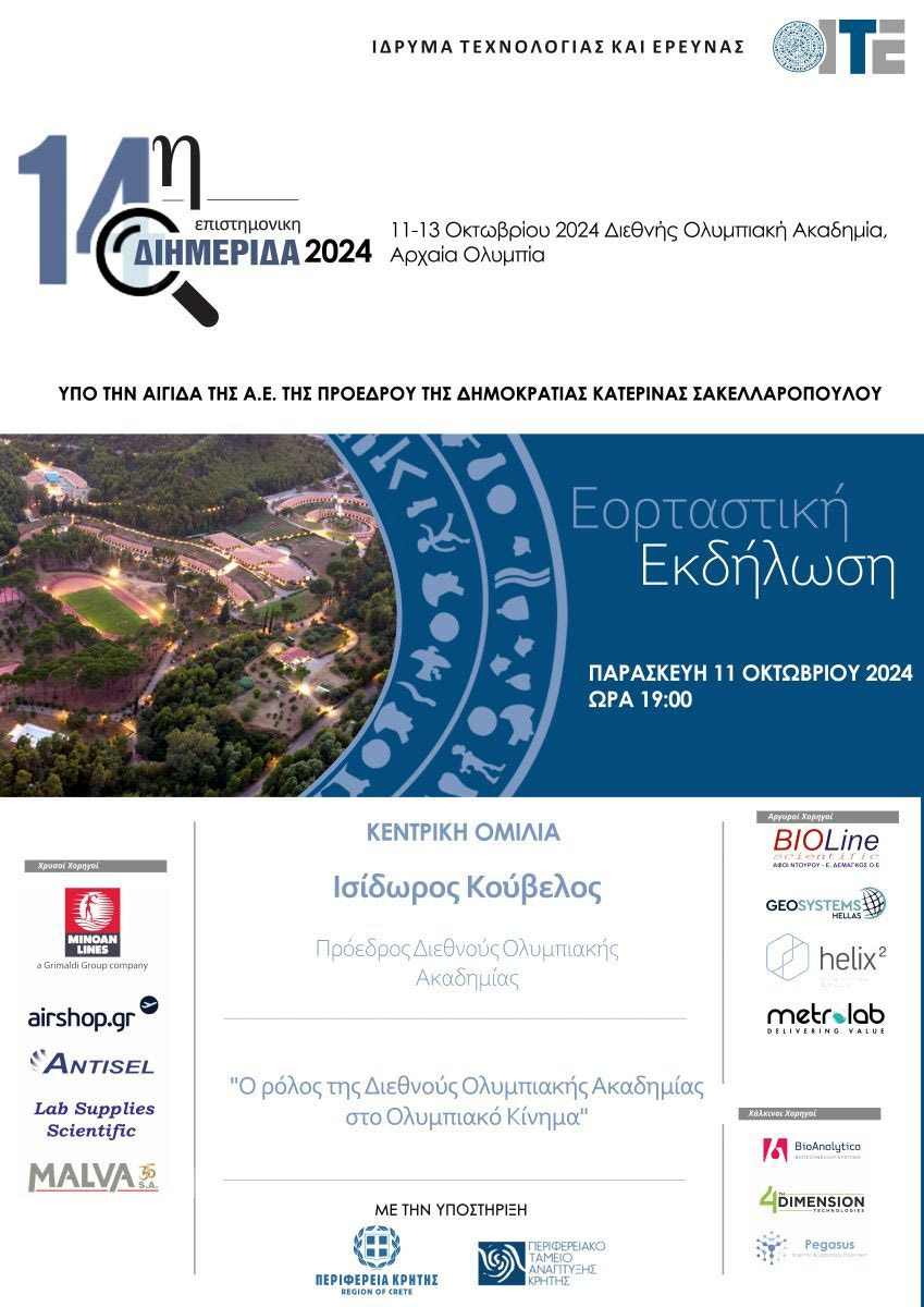 Tη 14η Επιστημονική του Διημερίδα διοργανώνει το Ίδρυμα Τεχνολογίας και Έρευνας (ΙΤΕ), την Παρασκευή 11, το Σάββατο 12 και την Κυριακή 13 Οκτωβρίου, η οποία θα πραγματοποιηθεί στο Συνεδριακό Κέντρο της Διεθνούς Ολυμπιακής Ακαδημίας (ΔΟΑ), στην Αρχαία Ολυμπία, και τελεί υπό την Αιγίδα της Α.Ε. της Προέδρου της Δημοκρατίας Κατερίνας Σακελλαροπούλου.