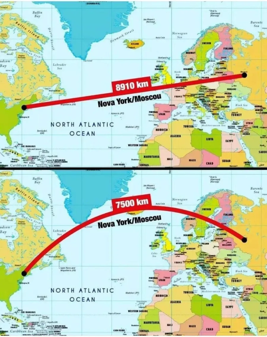 Ειδικότερα, σύμφωνα με το Geografica οι διαδρομές των αεροπλάνων είναι καμπύλες, όχι ευθείες, επειδή η Γη είναι σφαιρική , και η συντομότερη διαδρομή μεταξύ δύο σημείων στην επιφάνειά της είναι μια γεωδαιτική καμπύλη, όχι μια ευθεία γραμμή.
