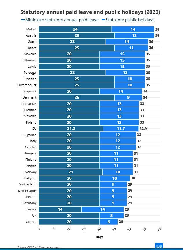 Μαζί με τις αργίες, οι ημέρες πληρωμένης άδειας στη Δανία είναι τουλάχιστον 34 – από τις περισσότερες στην ΕΕ. Η Ελλάδα έχει το χαμηλότερο αριθμό υποχρεωτικών αδειών πανευρωπαϊκά, μόλις 26 μαζί με τις αργίες, έναντι 33 του μέσου όρου της ΕΕ.