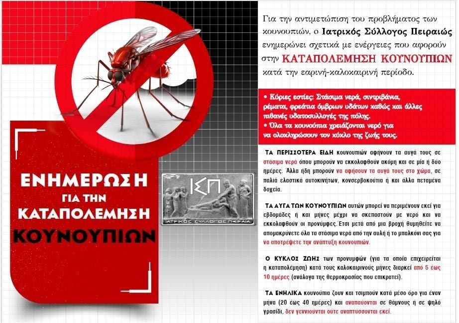 Για την εαρινή και θερινή περίοδο, ο Ιατρικός Σύλλογος Πειραιώς προτείνει στους πολίτες, για να προστατευθούν από τα τσιμπήματα από τα κουνούπια να φορούν ανοιχτόχρωμα, μακριά και άνετα ρούχα. Επίσης συνιστά την τοποθέτηση σήτας σε πόρτες και παράθυρα. Επιβάλλεται η χρήση κουνουπιέρας στις κούνιες των μωρών. Επίσης, συνιστά τη χρήση ανεμιστήρων ή κλιματιστικών διότι ο αέρας μειώνει τη δραστηριότητά τους.