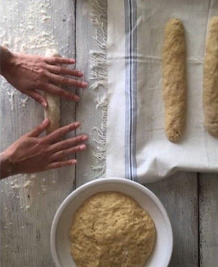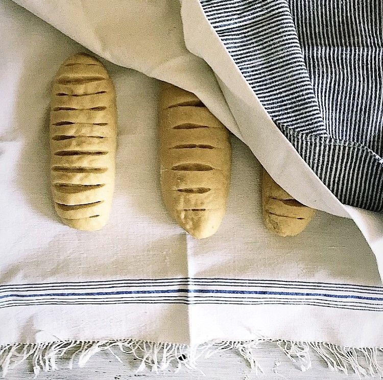 Χωρίζουμε τη ζύμη σε ίσα μέρη, πλάθουμε μακρόστενα κυλινδρικά ψωμάκια. Με το μαχαίρι χαράζουμε κάθετες φετούλες. Τοποθετούμε τα ψωμάκια σε ταψί στο οποίο έχουμε στρώσει αντικολλητικό χαρτί, αφήνοντας απόσταση μεταξύ τους γιατί θα απλώσουν.