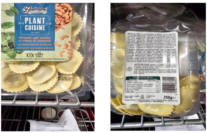 Ειδικότερα, πρόκειται για φρέσκα ζυμαρικά με γέμιση σπανάκι και κάσιους με εμπορική ονομασία «Bertagni Plant Cuisine».