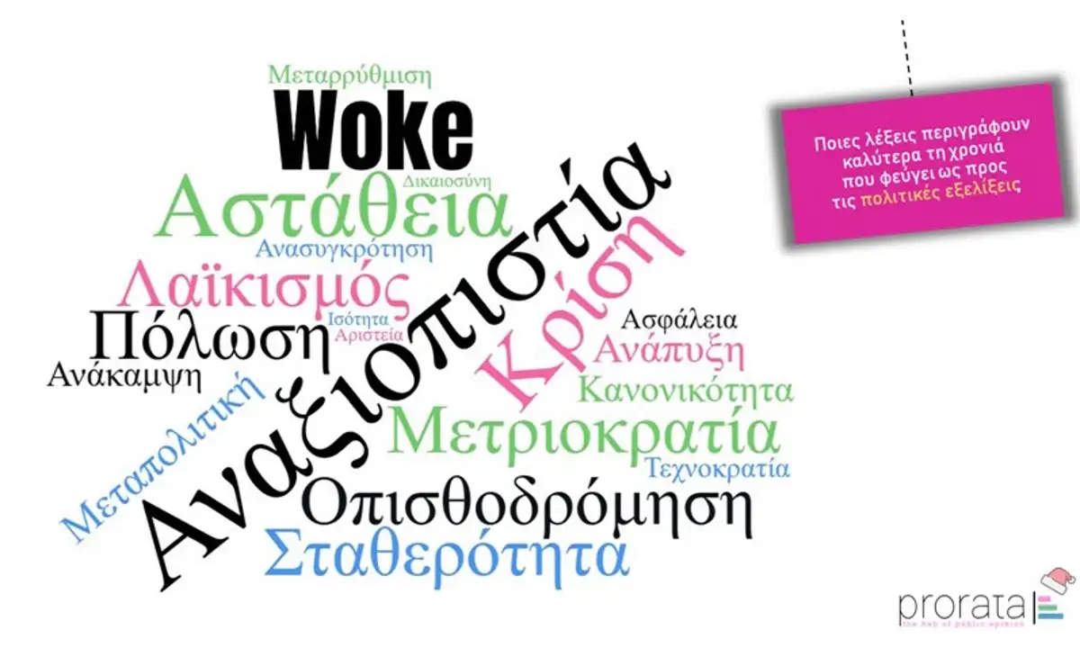 Σύμφωνα με τα αποτελέσματα της ετήσιας εορταστικής μελέτης της Prorata που διεξήχθη ποσοτικά σε αντιπροσωπευτικό δείγμα 1.634 ατόμων αλλά και ποιοτικά σε 4 ομάδες εστίασης (focusgroups), στην κορυφή της λίστας αποτίμησης των πολιτικών εξελίξεων του 2024 βρίσκονται οι λέξεις «αναξιοπιστία», «κρίση», «αστάθεια» και «οπισθοδρόμηση».