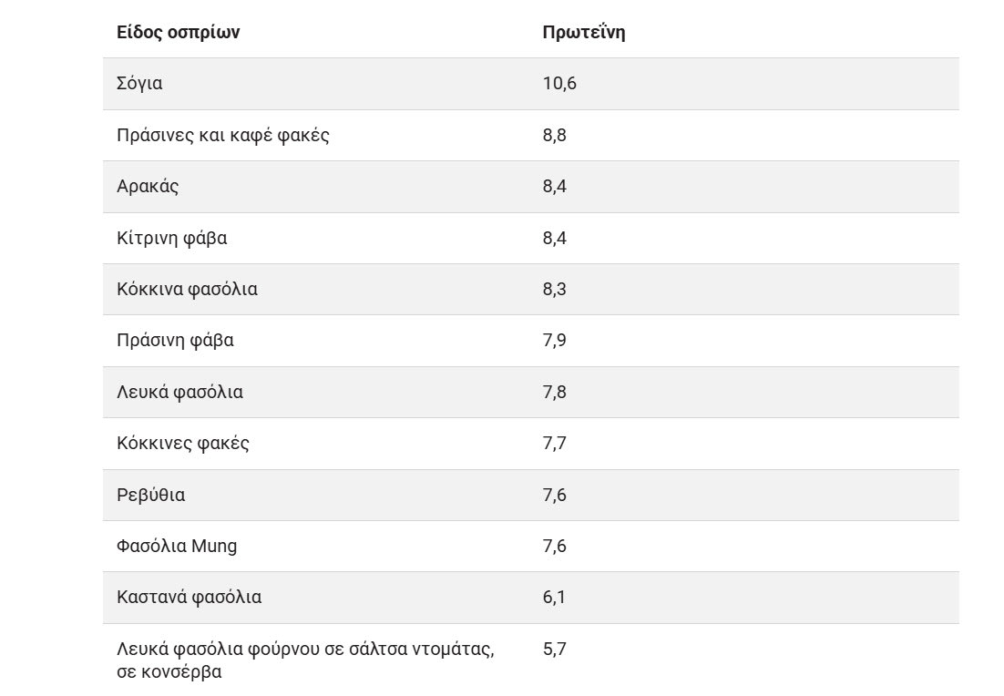 Σύμφωνα με τις πληροφορίες συγκεκριμένα, οι φακές, τα ρεβίθια, τα μαύρα φασόλια και τα μπιζέλια, όλα παρέχουν μια φυτική πηγή πρωτεΐνης. Αξίζει να σημειωθεί, πως η ακριβής περιεκτικότητα σε πρωτεΐνη στα όσπρια, ποικίλλει ανάλογα με τη συγκεκριμένη ποικιλία και τις συνθήκες για τον τρόπο καλλιέργειας.