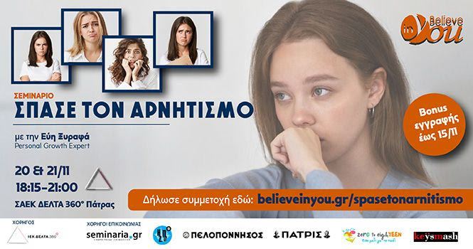 Στον νέο κύκλο σεμιναρίων του Believe in You “Σπάσε τον αρνητισμό” που ταξιδεύει για πρώτη φορά στην Πάτρα, η εισηγήτρια Εύη Ξυραφά θα μοιραστεί το πώς μπορείτε να σπάσετε τον φαύλο κύκλο της αρνητικότητας, που τόσο βλάπτει την ψυχική και σωματική σας υγεία.
