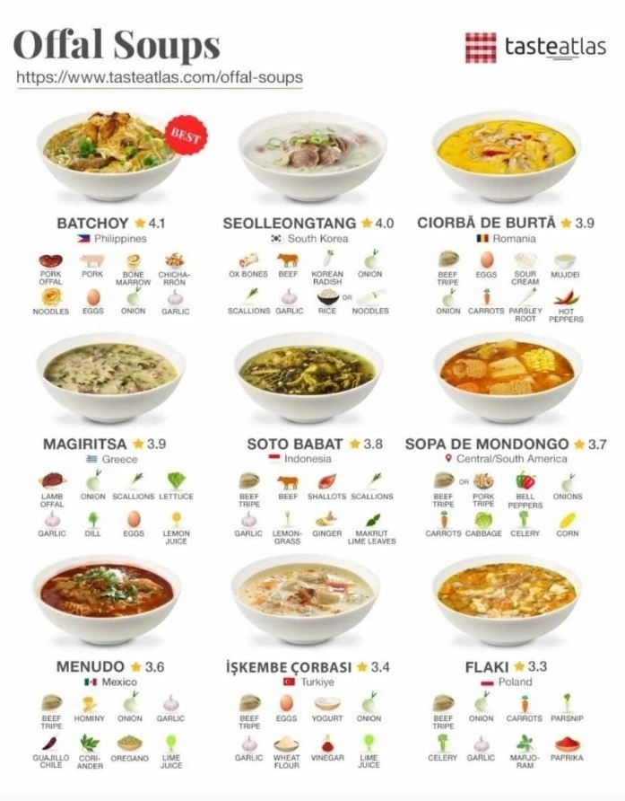 Την πρώτη θέση κατακτά η φιλιππινέζικη «Batchoy», μια σούπα με νουντλς, με χοιρινές μπουκιές, ζωμό κότας και μοσχαρίσιο φιλέτο. Στην δεύτερη θέση βρίσκεται η τουρκική «Kelle paça çorbası» με κομμάτια προβάτου ή κατσικιού, κρεμμύδια και αλάτι.