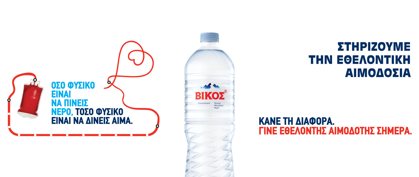 Με το μότο «Όσο φυσικό είναι να πίνεις νερό, τόσο φυσικό είναι να δίνεις αίμα», το φυσικό μεταλλικό νερό Βίκος μας προτρέπει να προσφέρουμε στους συνανθρώπους μας το ύψιστο δώρο αγάπης, ένα αγαθό που είναι σε ανεπάρκεια και ο μόνος παραγωγός του είναι ο άνθρωπος. Ένα πραγματικό και το πιο ουσιαστικό δώρο ζωής, καθώς δεν υπάρχει μεγαλύτερη προσφορά από την ίδια την ζωή.