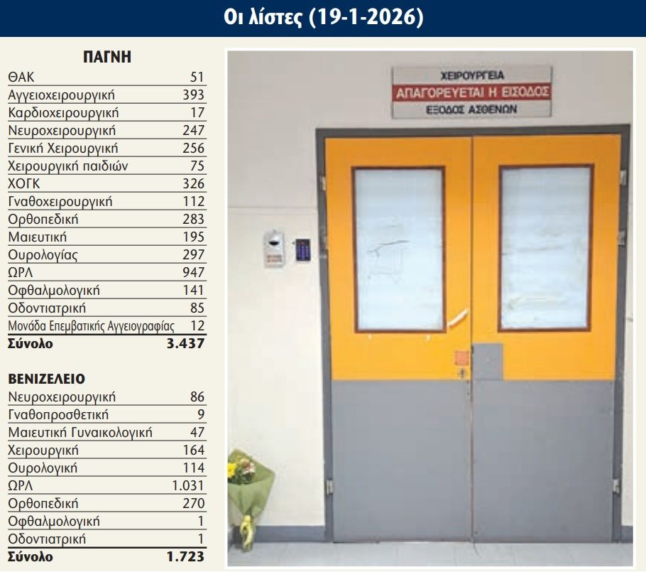 Η μεγαλύτερη λίστα, σύμφωνα με τα στοιχεία (19 Ιανουαρίου του 2026) που έδωσε στο patris.gr ο πρόεδρος Εργαζομένων του ΠΑΓΝΗ, Δημήτρης Βρύσαλης, βρίσκεται στο Πανεπιστημιακό, με 3.437 ασθενείς που είναι σε αναμονή για επέμβαση.