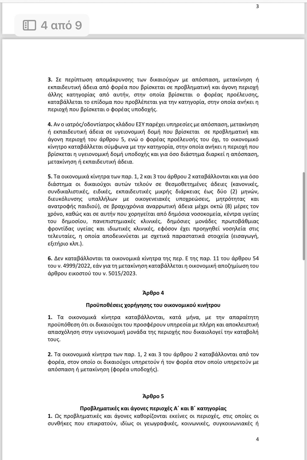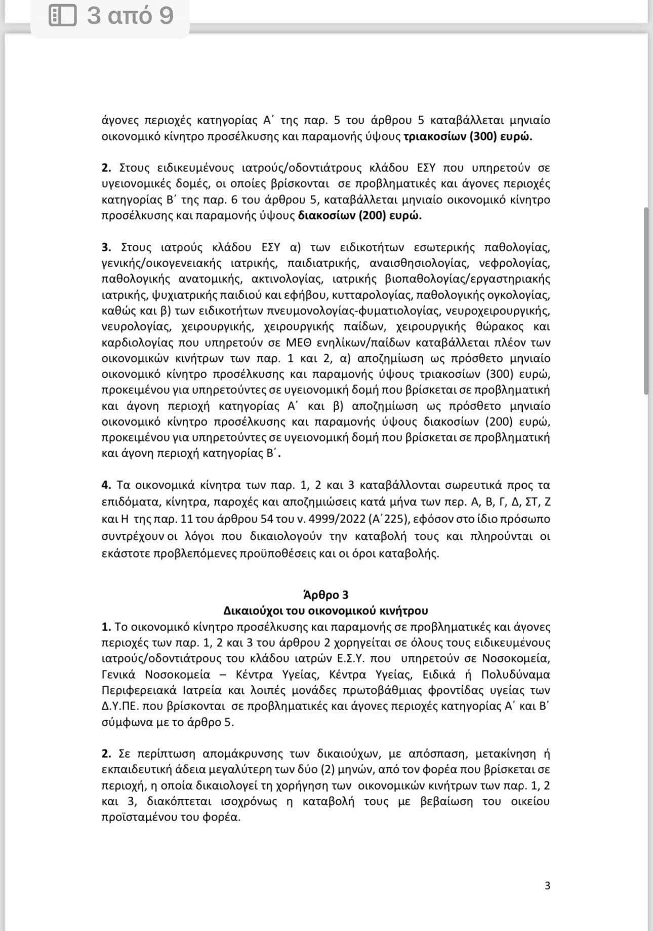 Στους ιατρούς/οδοντιάτρους κλάδου ΕΣΥ που υπηρετούν σε υγειονομικές δομές, οι οποίες εδρεύουν σε προβληματικές και άγονες περιοχές κατηγορίας Α’ καταβάλλεται μηνιαίο οικονομικό κίνητρο προσέλκυσης και παραμονής ύψους 300 € και σε προβληματικές και άγονες περιοχές κατηγορίας Β΄ καταβάλλεται μηνιαίο οικονομικό κίνητρο προσέλκυσης και παραμονής ύψους 200 €..