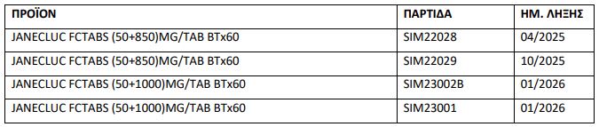 Αποφασίζουμε την ανάκληση των παρτίδων του παραπάνω πίνακα, του φαρμακευτικού προϊόντος JANECLUC FCTABS (50+850)MG/TAB BTx60 και JANECLUC FCTABS (50+1000)MG/TAB BTx60, λόγω αποτελεσμάτων εκτός προδιαγραφών κατά τον έλεγχο νιτροζαμινών στο πλαίσιο ελέγχων σταθερότητας.