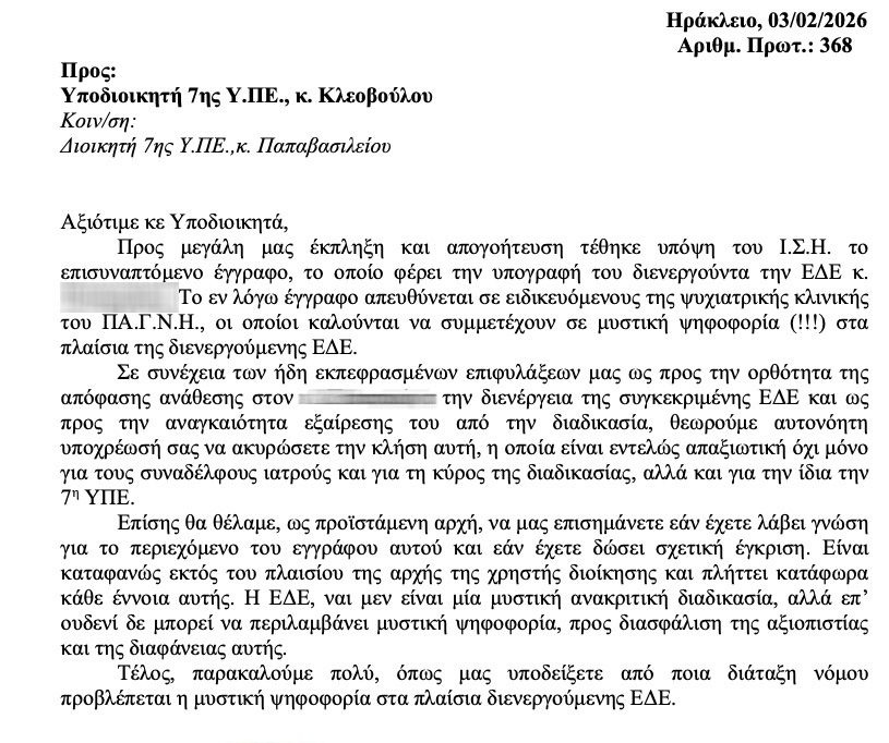Ο Ιατρικός Σύλλογος Ηρακλείου έστειλε επιστολή διαμαρτυρίας στη Διοίκηση της 7ης ΥΠΕ Κρήτης, όχι μόνο για το θέμα της μυστικής ψηφοφορίας, αλλά και γιατί η ΕΔΕ έχει ανατεθεί σε ψυχίατρο στον οποίο η διευθύντρια της Κλινικής, όπως λένε οι πληροφορίες, έχει κάνει αναφορά γιατί «έδωσε εντολή για εισαγωγή ασθενούς στην Ψυχιατρική Κλινική τηλεφωνικά, χωρίς ο ίδιος να βρίσκεται στο νοσοκομείο και χωρίς να έχει εξετάσει τον ασθενή».Ο Ιατρικός Σύλλογος έχει ζητήσει, λοιπόν, την εξαίρεση του συγκεκριμένου γιατρού από την διαδικασία για λόγους -όπως σημειώνει- αμεροληψίας, θεσμικής τάξεως, αντικειμενικότητας και διαφάνειας.