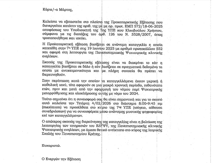 Στην κλήση των μαρτύρων που υπογράφει ο ψυχίατρος, ο οποίος κάνει την έρευνα που του ανέθεσε ο υποδιοικητής της 7ης ΥΠΕ Κρήτης, κ. Κλεοβούλου, αναφέρεται: