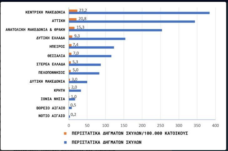 Συχνότητα: Από τον Ιανουάριο έως τον Ιούνιο του 2023, 1.656 θύματα δαγκώματος από σκύλο αναζήτησαν ιατρική φροντίδα σε δομές υγειονομικής περίθαλψης. Η συχνότητα περιστατικών ήταν 15,8 περιπτώσεις ανά 100.000 κατοίκους. Είναι ενδιαφέρον ότι η συχνότητα των επισκέψεων διέφερε σημαντικά μεταξύ των διαφόρων περιοχών της Ελλάδας.