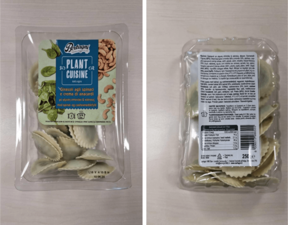 Συγκεκριμένα πρόκειται για το προϊόν με ξενόγλωσση ονομασία πώλησης «Girasoli vegani spinaci e anacardi 250×6» και εμπορική ονομασία «Bertagni Plant Cuisine».