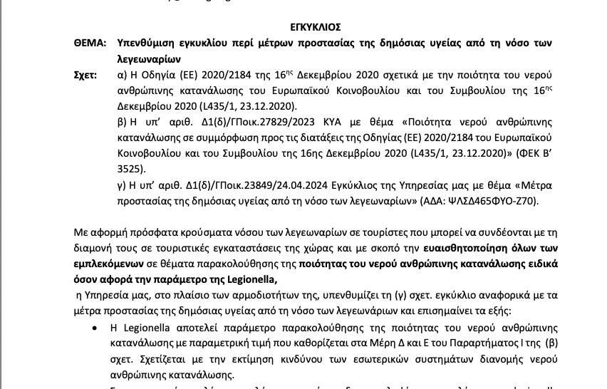 Σε εγκύκλιο του Υπουργείου Υγείας με την ένδειξη «Εξαιρετικά Επείγον» τονίζεται, μεταξύ άλλων: «Με αφορμή πρόσφατα κρούσματα νόσου των λεγεωναρίων σε τουρίστες, τα οποία μπορεί να συνδέονται με τη διαμονή τους σε τουριστικές εγκαταστάσεις της χώρας και με σκοπό την ευαισθητοποίηση όλων των εμπλεκόμενων σε θέματα παρακολούθησης της ποιότητας του νερού ανθρώπινης κατανάλωσης, ειδικά όσον αφορά την παράμετρο της Legionella, η Υπηρεσία μας, στο πλαίσιο των αρμοδιοτήτων της, υπενθυμίζει την σχετική εγκύκλιο αναφορικά με τα μέτρα προστασίας της Δημόσιας Υγείας από τη νόσο των λεγεωναρίων και επισημαίνει τα εξής: