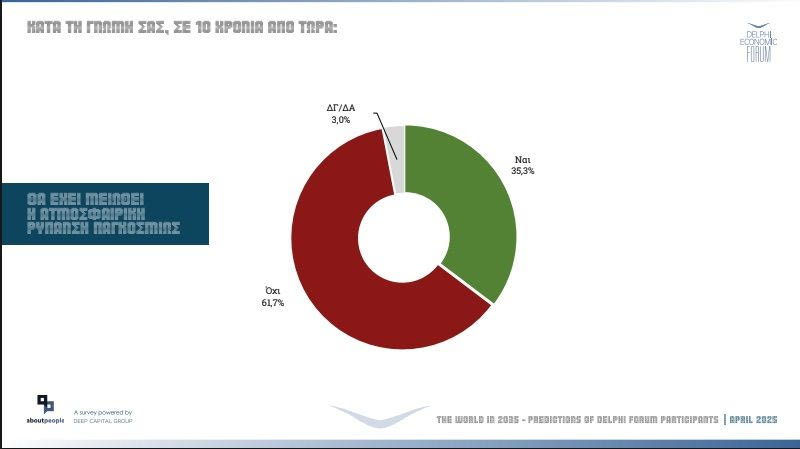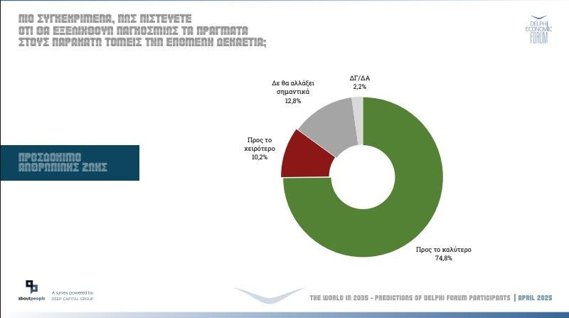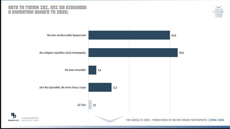 Οι παραπάνω είναι μερικές μόνο από τις ερωτήσεις στις οποίες κλήθηκαν να απαντήσουν συμμετέχοντες (ομιλητές και σύνεδροι) του 10ου Οικονομικού Φόρουμ των Δελφών, στο πλαίσιο της έρευνας «Ο κόσμος το 2035», που πραγματοποίησε το ίδιο το Φόρουμ, σε συνεργασία με την εταιρία ερευνών aboutpeople, και με την υποστήριξη της Deep Capital Group.