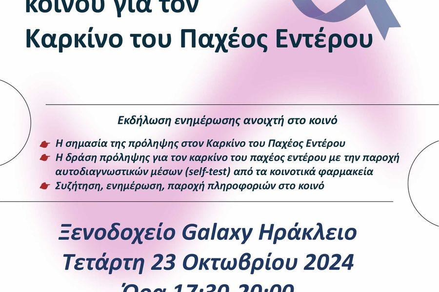 Ημερίδα ενημέρωσης με θέμα τον Καρκίνο του Παχέος Εντέρου θα πραγματοποιηθεί από τον Φαρμακευτικό Σύλλογο Ηρακλείου την Τετάρτη 23 Οκτωβρίου 2024 στο Ξενοδοχείο Galaxy στο Ηράκλειο στις 17.30.