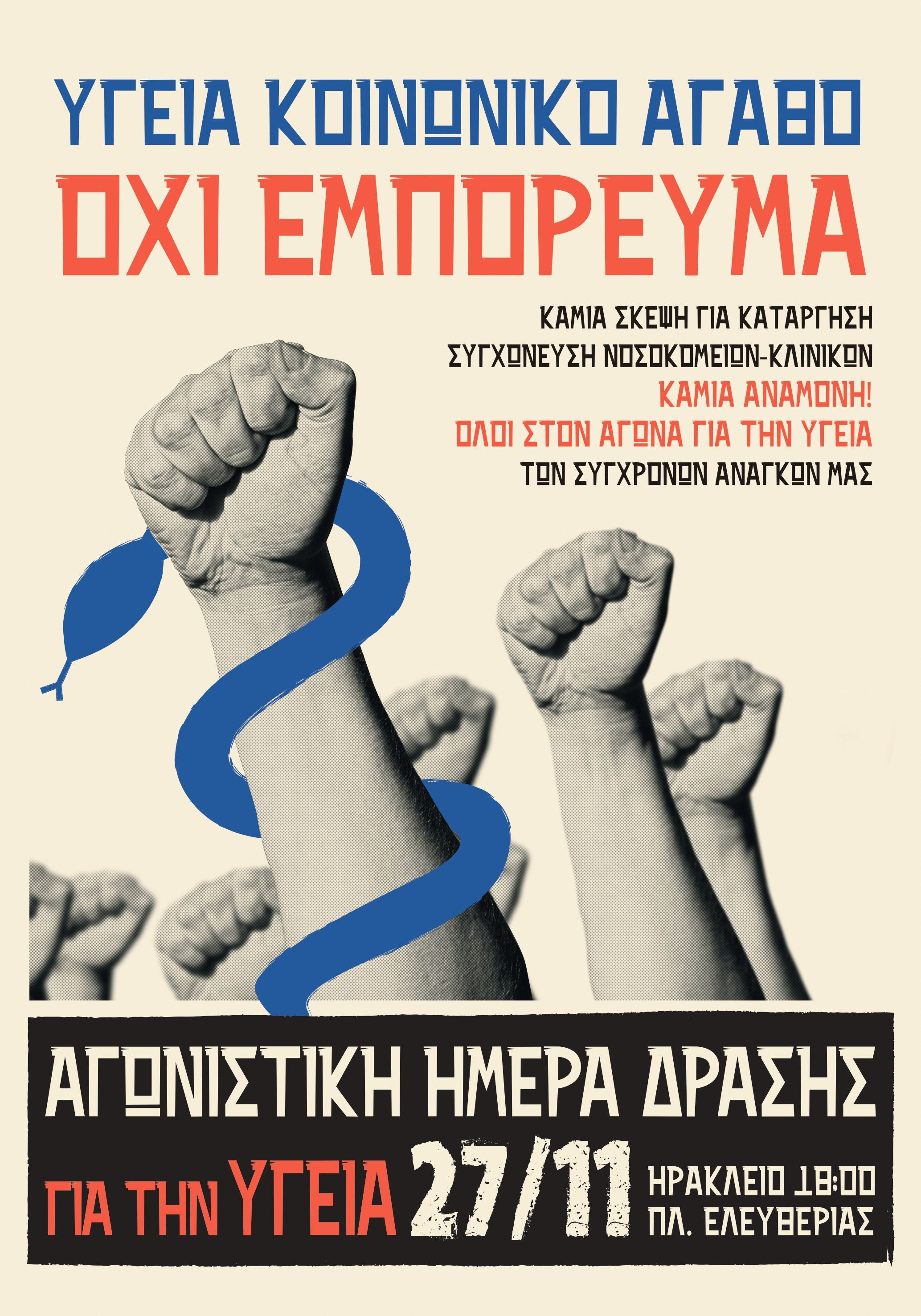 Καθημερινά μεγαλώνει ο αριθμός των σωματείων, συλλόγων και άλλων φορέων που δηλώνουν τη στήριξη τους στην αγωνιστική ημέρα δράσης για την υγεία, την Πέμπτη 27 Νοεμβρίου (6μμ) στην πλατεία Ελευθερίας στο Ηράκλειο.