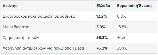 Τα στοιχεία του ECDC δείχνουν ότι η Ελλάδα έχει πολύ χειρότερη εικόνα από τον μέσο ευρωπαϊκό όρο. Ένας στους οκτώ ασθενείς (12,2%) παθαίνουν ενδονοσοκομειακές λομώξεις, έναντι μόλις 6,8% στην Ευρώπη.