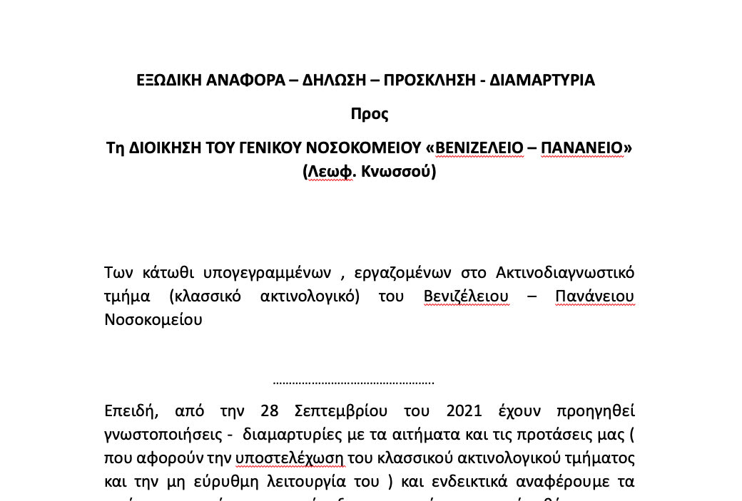 «Για όλους τους παραπάνω λόγους, τους οποίους μπορούμε να αποδείξουμε οπουδήποτε και οποτεδήποτε χρειαστεί, με έγγραφα και μάρτυρες και για να εκλείψουν οι κίνδυνοι από τη μη εύρυθμη λειτουργία του κλασσικού ακτινολογικού τμήματος του Βενιζέλειου – Πανάνειου Νοσοκομείου για ασθενείς, προσωπικό και υλικοτεχνικό εξοπλισμό, καλούμε άμεσα τους αρμόδιους να προβούν σε κάθε απαραίτητη ενέργεια για την πρόσληψη τουλάχιστον 8 τεχνολόγων – ακτινολόγων και την παρουσία ιατρού ακτινολόγου στα χειρουργεία, τον οποίο θα συνεπικουρούμε όποτε υπάρχει ανάγκη ακτινοσκόπησης ασθενούς, όπως εκ του Νόμου προβλέπεται».