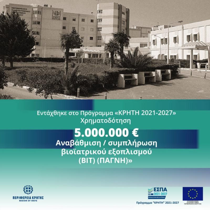 Την υπογραφή της πρόσκλησης για την υποβολή προτάσεων που αφορούν στην αναβάθμιση και συμπλήρωση του βιοϊατρικού εξοπλισμού του Πανεπιστημιακού Γενικού Νοσοκομείου Ηρακλείου (ΠΑΓΝΗ), ανακοίνωσε ο Περιφερειάρχης Κρήτης Σταύρος Αρναουτάκης.