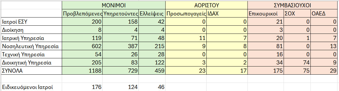 Η στελέχωση όπως μας διατέθηκε από το τμήμα Ανθρώπινου Δυναμικού την 31/1/2025 φαίνεται στον παρακάτω πίνακα, σύμφωνα με τον υπάρχον οργανισμό του νοσοκομείου, ο οποίος σε καμιά περίπτωση δε συνάδει με τις πραγματικές υγειονομικές ανάγκες των πολιτών και την ανάπτυξη του νοσοκομείου τα τελευταία έτη. Θα ανακοινώσουμε την ανάλυση των κενών και τον προτάσεών μας για τον οργανισμό του νοσοκομείου στο άμεσο μέλλον.