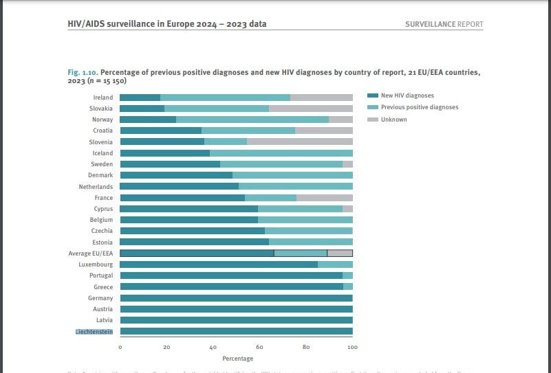 Την 5η θέση στη λίστα των χωρών της Ευρώπης με τις περισσότερες νέες διαγνώσεις του ιού HIV το 2023 κατέχει η Ελλάδα. Στην πρώτη θέση βρίσκεται το Λιχτενστάιν και ακολουθούν η Λετονία, η Αυστρία, η Γερμανία και η Ελλάδα.