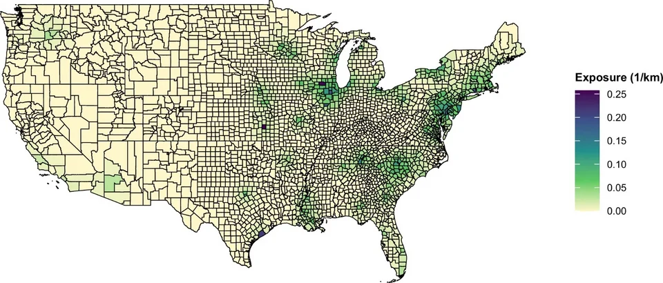 Ο παρακάτω χάρτης δείχνει την χωρική κατανομή της αθροιστικής εγγύτητας σε εν λειτουργία πυρηνικούς σταθμούς το 2000 για κάθε κομητεία των ΗΠΑ. Οι πιο σκούρες μωβ αποχρώσεις υποδηλώνουν μεγαλύτερη εγγύτητα σε πολλαπλούς σταθμούς σε ακτίνα 200 χιλιομέτρων, ενώ οι πιο ανοιχτές κίτρινες αποχρώσεις υποδηλώνουν μικρότερη εγγύτητα.