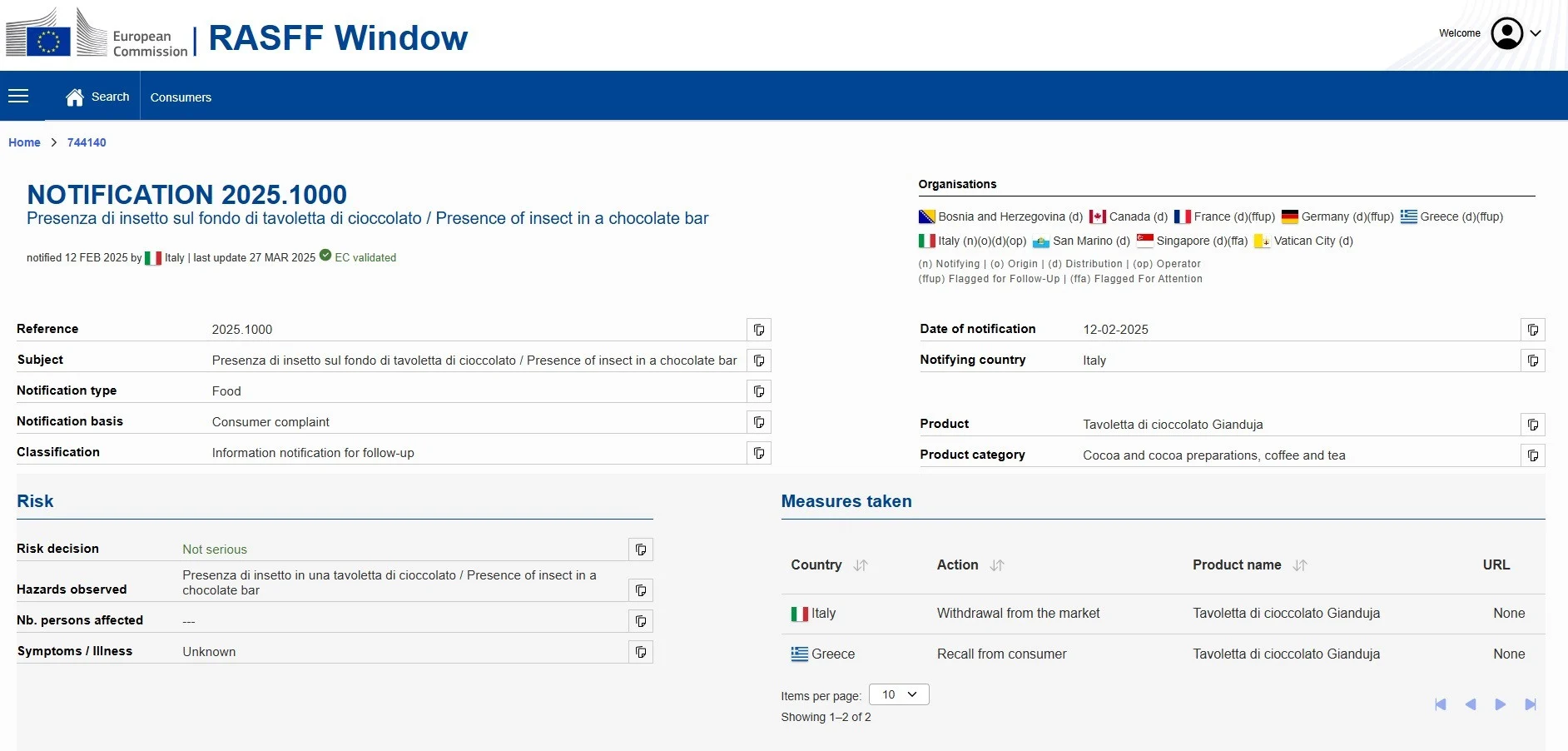 Ειδικότερα, σύμφωνα με το Ευρωπαϊκό Σύστημα Ταχείας ειδοποίησης για επικίνδυνα τρόφιμα RASFF (Rapid Alert System for Food and Feed) προειδοποίηση για το επίμαχο ακατάλληλο τρόφιμο στάλθηκε και στη χώρα μας.