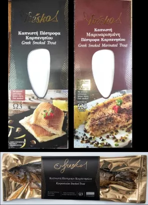 «Καπνιστή Μαριναρισμένη Πέστροφα Καρπενησίου (φιλέτο)», με εμπορική ονομασία «frésco» και ημερομηνία παραγωγής από 24.01.2024 έως και 09.04.2024 (ημερομηνία λήξης από 21.08.2024 έως και 05.11.2024).«Καπνιστή Πέστροφα Καρπενησίου (ολόκληρη)», με εμπορική ονομασία «fresco» και ημερομηνία παραγωγής από 24.01.2024 έως και 28.03.2024 (ημερομηνία λήξης από 22.07.2024 έως και 24.09.2024).