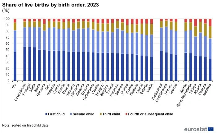 Το 46,4% όλων των παιδιών που γεννήθηκαν στην Ε.Ε. το 2023 ήταν πρώτο παιδί. Το ποσοστό αυτό ξεπέρασε το 50% σε: