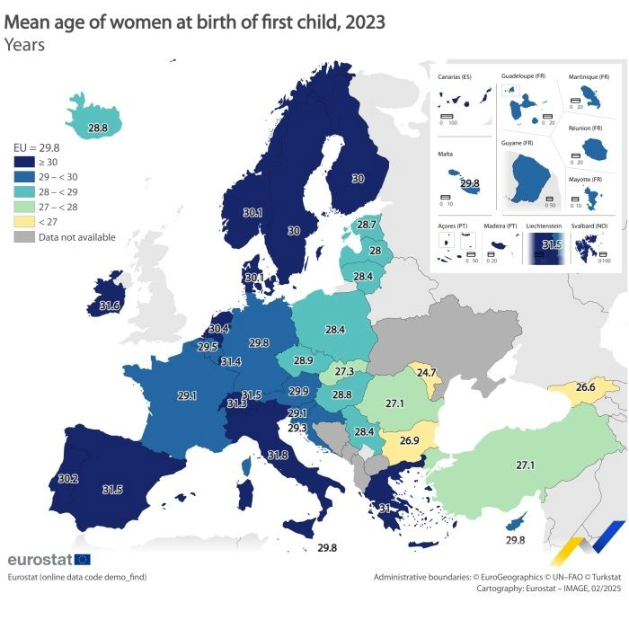 Στην Ευρωπαϊκή Ένωση, η μέση ηλικία των γυναικών που γίνονται μητέρες για πρώτη φορά συνεχίζει να αυξάνεται, φτάνοντας τα 29,8 έτη το 2023, σύμφωνα με τα τελευταία στοιχεία της Eurostat.