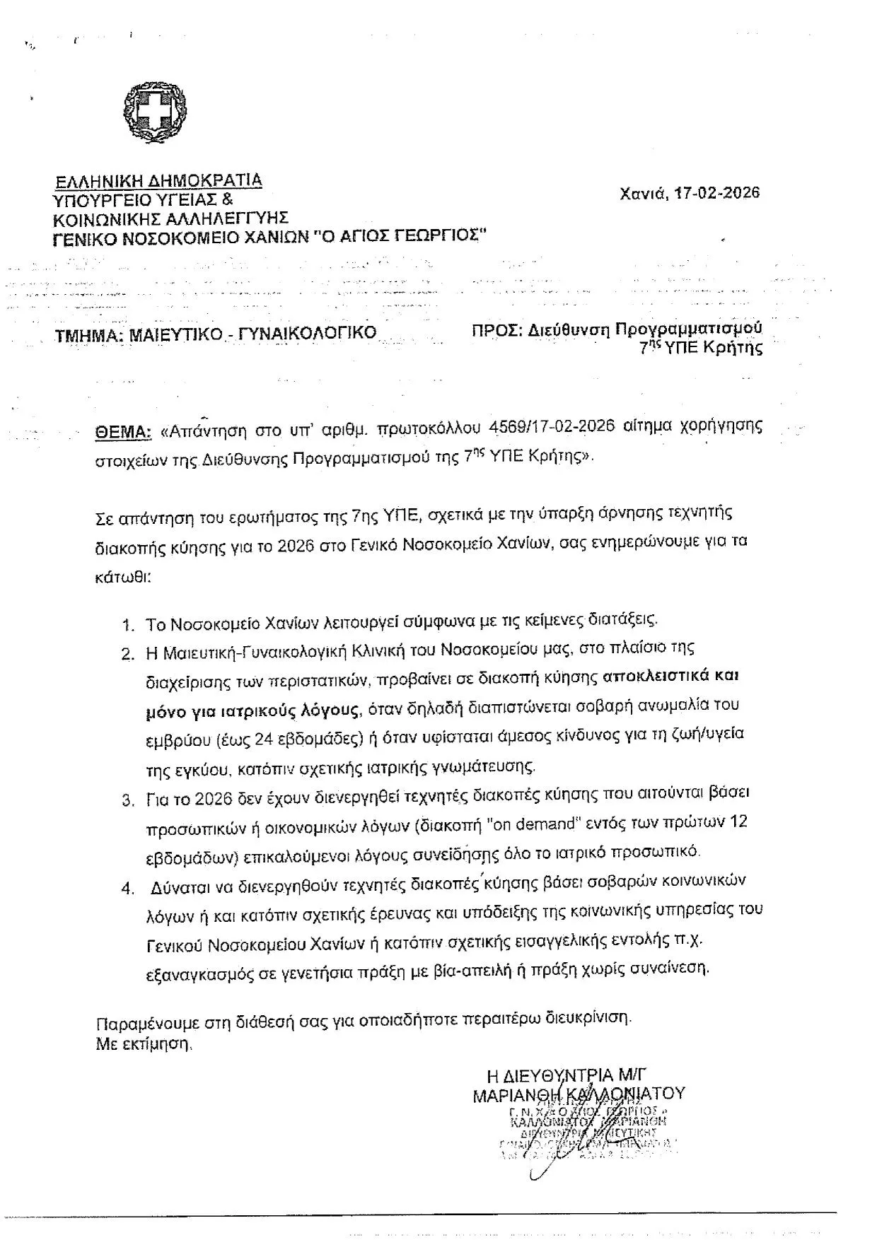 Συγκεκριμένα, η διευθύντρια μαιευτικής κλινικής διευκρινίζει ότι προβαίνουν σε διακοπή κύησης «αποκλειστικά και μόνο για ιατρικούς λόγους, όταν δηλαδή διαπιστώνεται σοβαρή ανωμαλία του εμβρύου (έως 24 εβδομάδες) ή όταν υφίσταται άμεσος κίνδυνος για τη ζωή/υγεία της εγκύου, κατόπιν σχετικής ιατρικής γνωμάτευσης». Προσθέτει πως «για το 2026 δεν έχουν διενεργηθεί τεχνητές διακοπές κύησης που αιτούνται βάσει προσωπικών ή οικονομικών λόγων (διακοπή “on demand” εντός των πρώτων 12 εβδομάδων) επικαλούμενοι λόγους συνείδησης όλο το ιατρικό προσωπικό». Το νοσοκομείο Χανίων δεν αναφέρει ότι παραπέμπει σε άλλη δημόσια δομή τις γυναίκες.