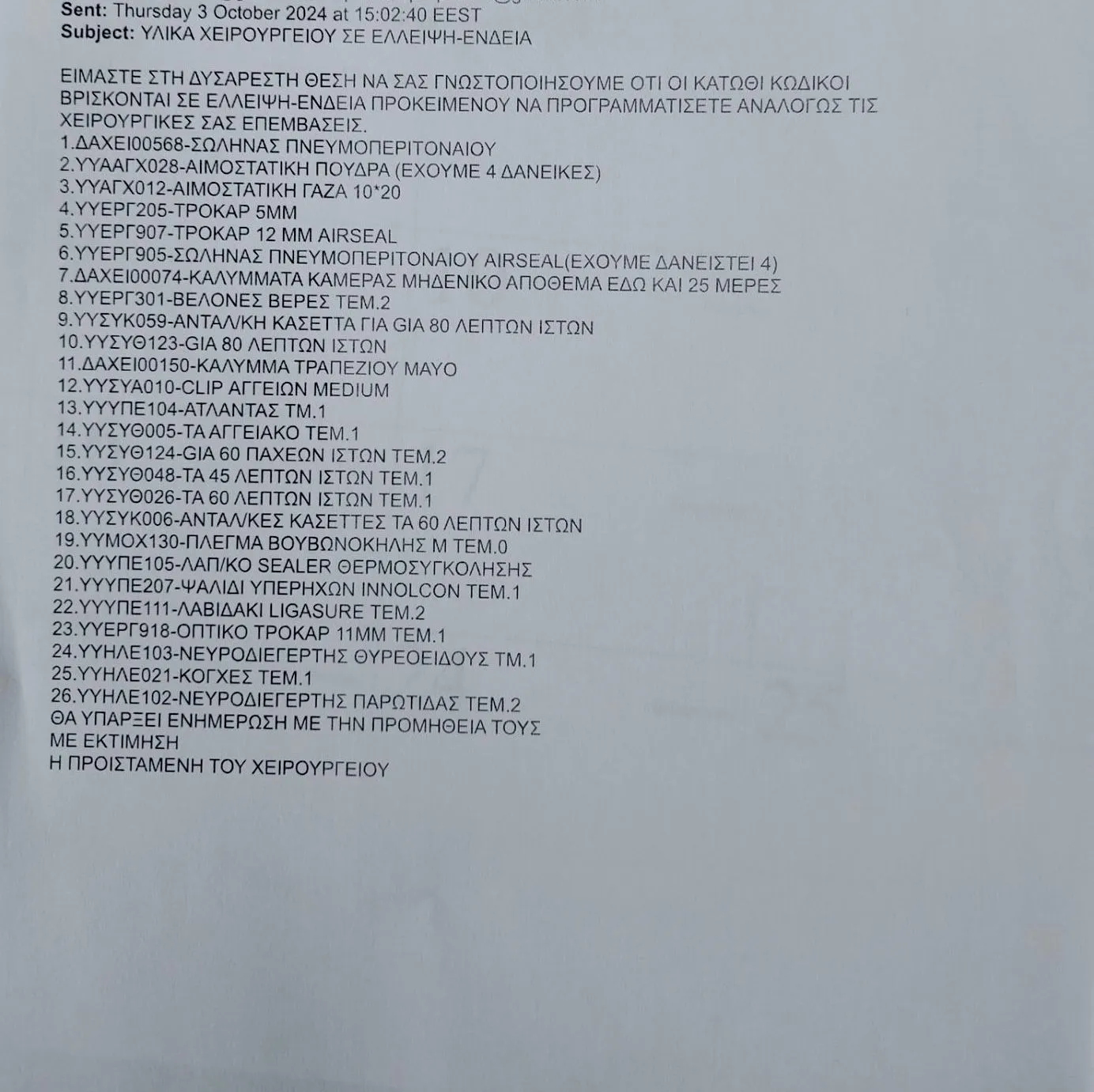 Το έγγραφο που αναφέρει τις ελλείψεις υλικών χειρουργείο στο Νοσοκομείο «Μεταξά»