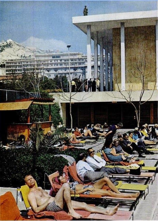 Η φωτογραφία δείχνει τουρίστες να λιάζονται σε πισίνα του Χίλτον, την ημέρα του πραξικοπήματος στις 21 Απριλίου του 1967, την ώρα που έξω από το ξενοδοχείο περνούν τανκς και ακούγονται πυροβολισμοί.