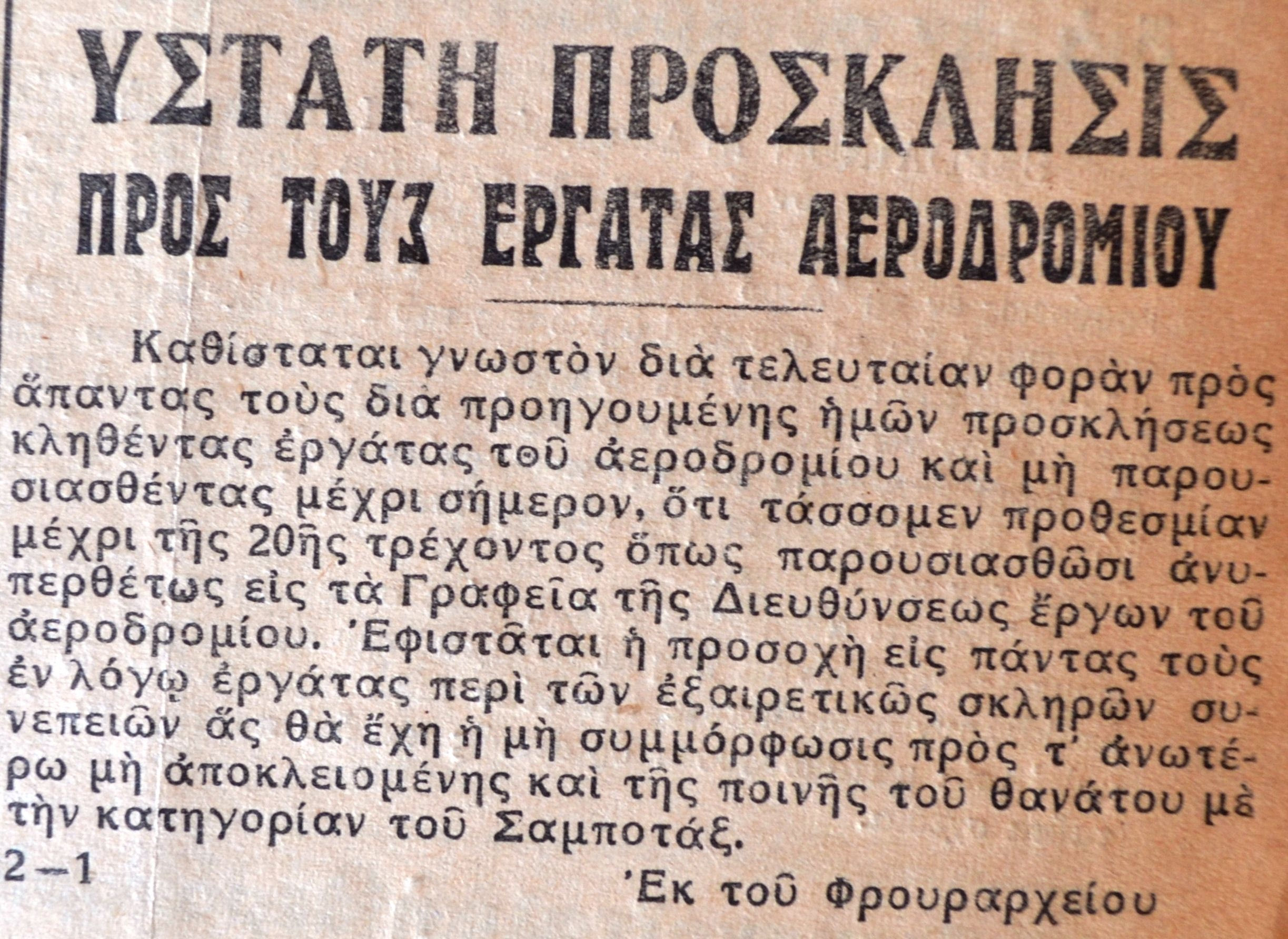 Καθίσταται γνωστόν δια τελευταίαν φοράν προς άπαντας τους δια προηγουμένης ημών προσκλήσεως κληθέντας εργάτας του αεροδρομίου και μη παρουσιασθέντας μέχρι σήμερον, ότι τάσσομεν προθεσμίαν μέχρι της 20ης τρέχοντος όπως παρουσιασθώσι ανυπερθέτως εις τα Γραφεία της Διευθύνσεως έργων του αεροδρομίου. Εφιστάται η προσοχή εις πάντας τους εν λόγω εργάτας περί των εξαιρετικώς σκληρών συνεπειών ας θα έχη η μη συμμόρφωσις προς τ’ανωτέρω μη αποκλειομένης και της ποινής του θανάτου με την κατηγορίαν του Σαμποτάζ