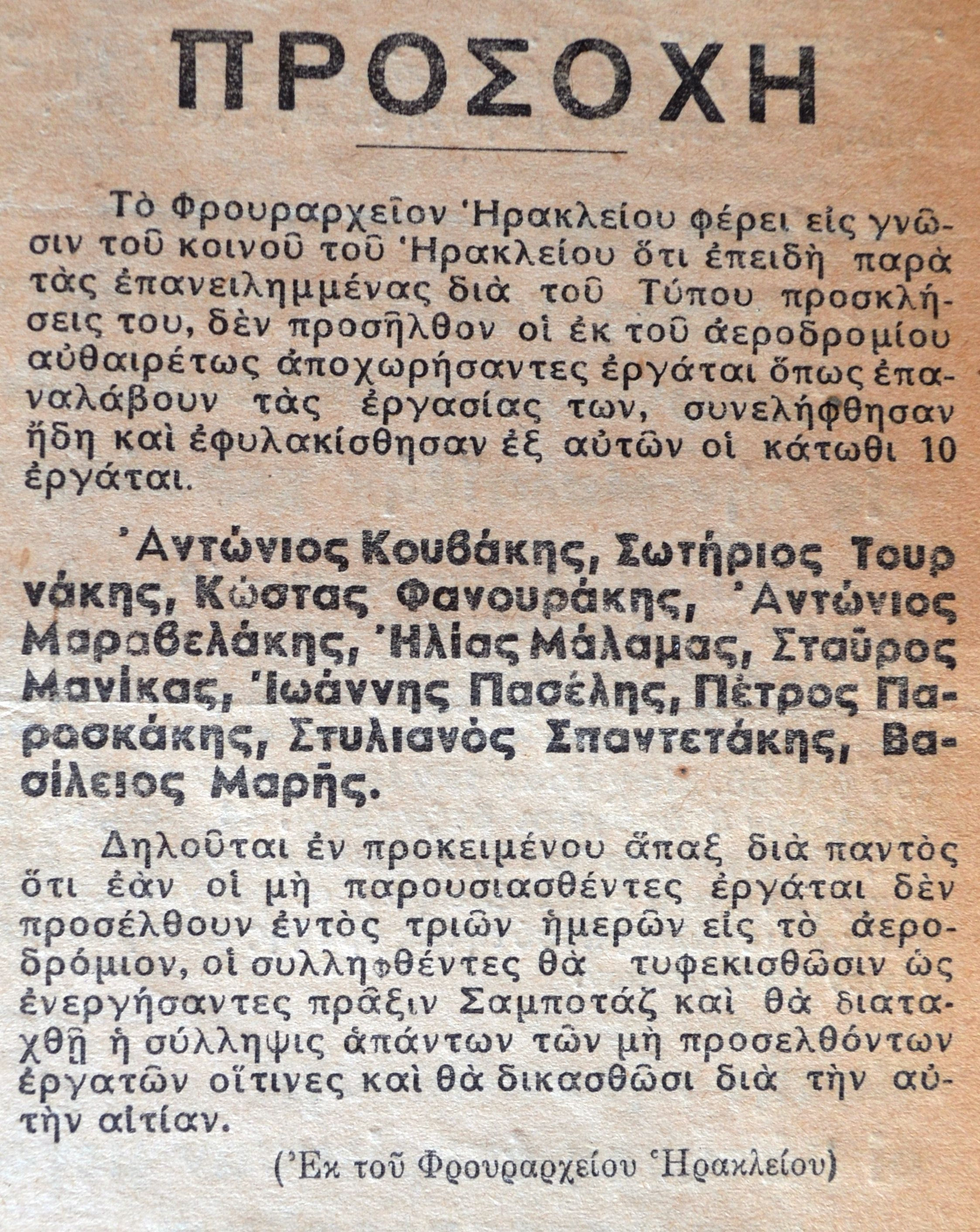 Το Φρουραρχείον Ηρακλείου φέρει εις γνώσιν του κοινού του Ηρακλείου ότι επειδή παρά τας επανειλημμένας δια του Τύπου προσκλήσεις του, δεν προσήλθον οι εκ του αεροδρομίου αυθαιρέτως αποχωρήσαντες εργάται όπως επαναλάβουν τας εργασίας των, συνελήφθησαν ήδη και εφυλακίσθησαν εξ αυτών οι κάτωθι 10 εργάται
