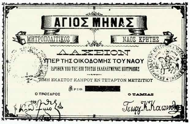 ιΑκόμα και λαχνοί είχαν εκδοθεί για να ενισχυθεί το έργο της ανέγερσης του Αγίου Μηνά