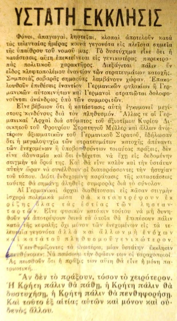 Αι γερμανικαί αρχαί διαθέτουσαι εις πάσαν στιγμήν ισχυρά πολεμικά μέσα θα καταστρέψουν εκ ρίζης όλας τας εστίας των ληστανταρτών. Είναι φυσικόν κατόπιν τούτου να μη δυνηθούν να αποτρέψουν δεινά τα οποία θα επιπέσουν πάλιν κατά της κεφαλής όχι μόνον των ενεχομένων εις τα τελευταία γεγονότα αλλά και άλλων μη ενόχων και κατά του πληθυσμού γενικώτερον.